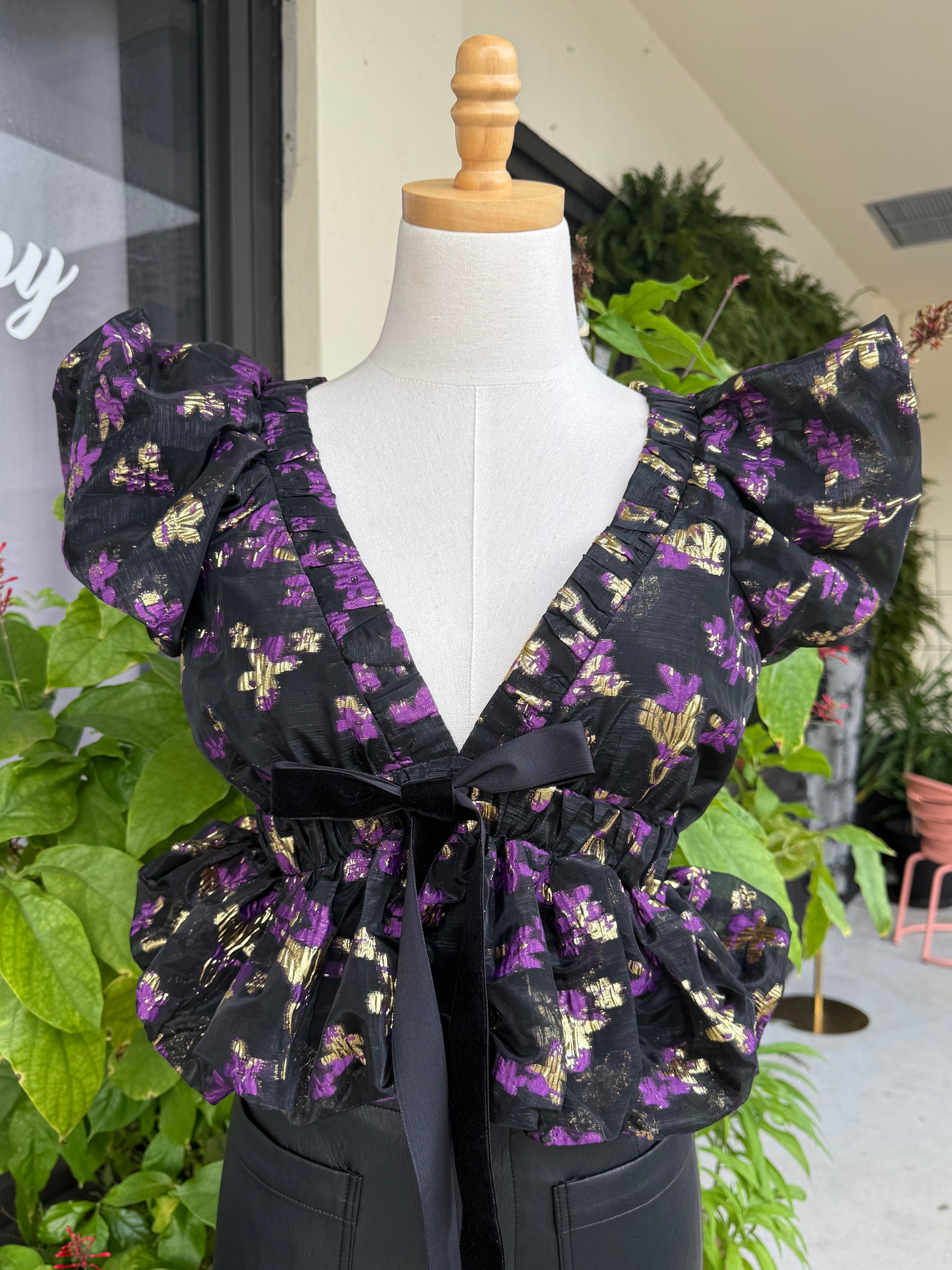 Meet the Adele Gold Lame Top—where sparkle meets sass! This dazzling piece features a luxe gold lamé base that shimmers with every move, paired with eye-catching purple accents that add unexpected flair. The plunging V-neckline creates an instantly chic silhouette, while ruffled sleeves bring a flirty, playful vibe that demands attention. Perfect for anyone ready to shine bright and make a bold fashion statement. Dress it up for a night out or style it casually for that effortlessly glamorous everyday look.